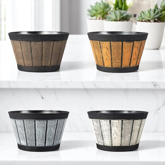 20cm Barrel Effect Garden Planters Rustic Cask Style Flower Pots Mixed Colours (Pack of 4 or 12)