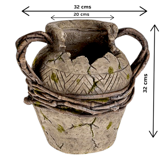 Enchanted urn pot with handle Rustic Broken Style Antique Vase Vintage Garden & Home Décor Aged Pot with Vine Detailing