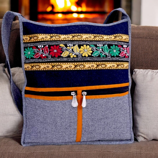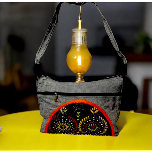 Handmade Embroidered Crossbody Shoulder Bag – Grey & Multi-Colour