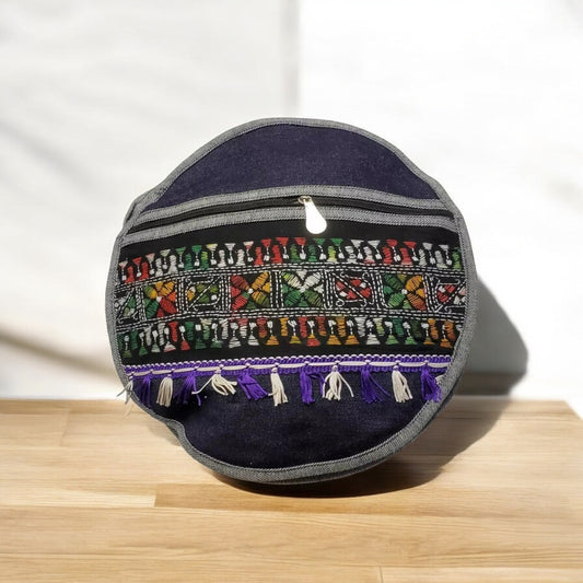 Handmade Round Denim Crossbody Bag | Boho Ethnic Embroidered Sling Bag | Multi-Zip Shoulder Purse