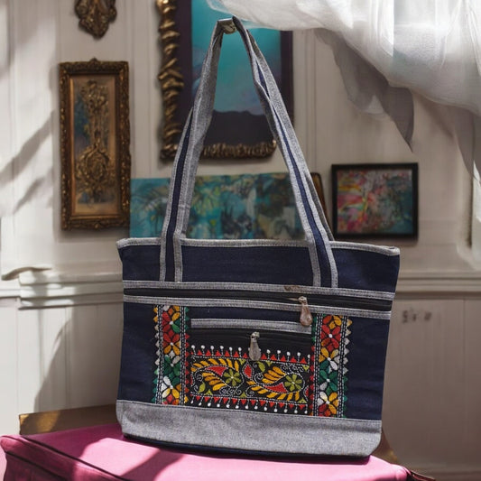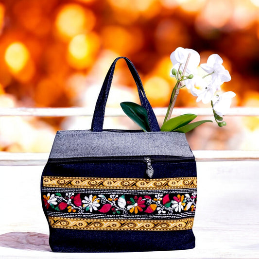 Handmade Denim Embroidered Shoulder Bag – 3 Zips
