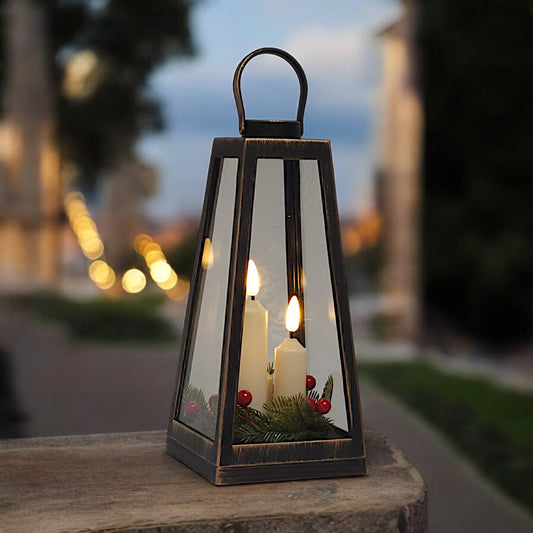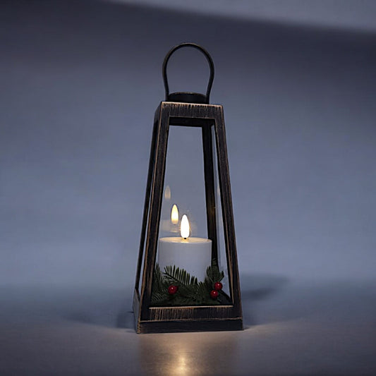 Rustic LED Lantern with Holly and Berries - Warm Glow, Festive Decor, 24x10x10cm