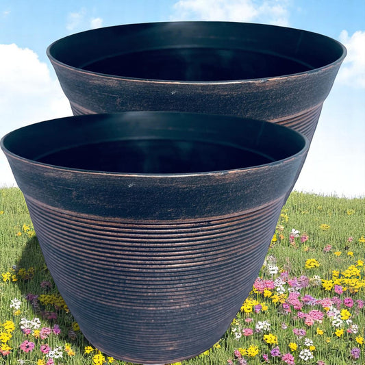 Set of 2 Large Black Bronze Garden Planters – Tall Round Plastic Plant Pots for Outdoor & Indoor Use (25.2cm x 9.2cm)