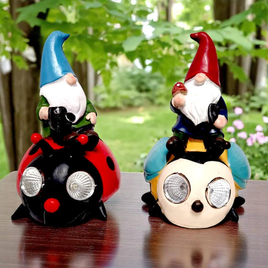 Solar Gnome Garden Ornament – Resin Gnome Statue on Ladybug & Bee with LED Lights (1 or 2 Pack)