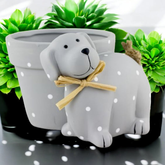 Cute Grey Dog Plant Pot – Polka Dot Resin Planter for Dog Lovers