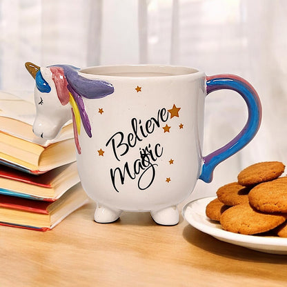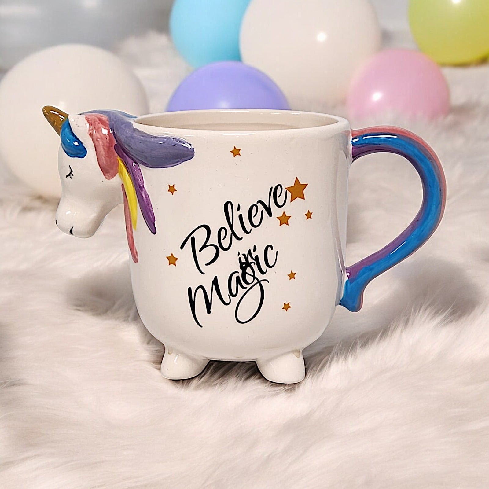 Add a touch of magic to your morning routine with this adorable unicorn ceramic mug. Featuring a whimsical unicorn design with a rainbow mane and tail, this mug is perfect for unicorn lovers and those who believe in the power of magic. The mug is adorned with the inspiring message "Believe in Magic" and features shimmering stars for an extra touch of enchantment.